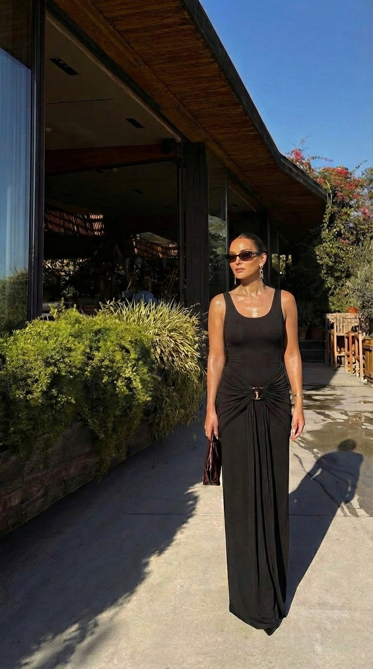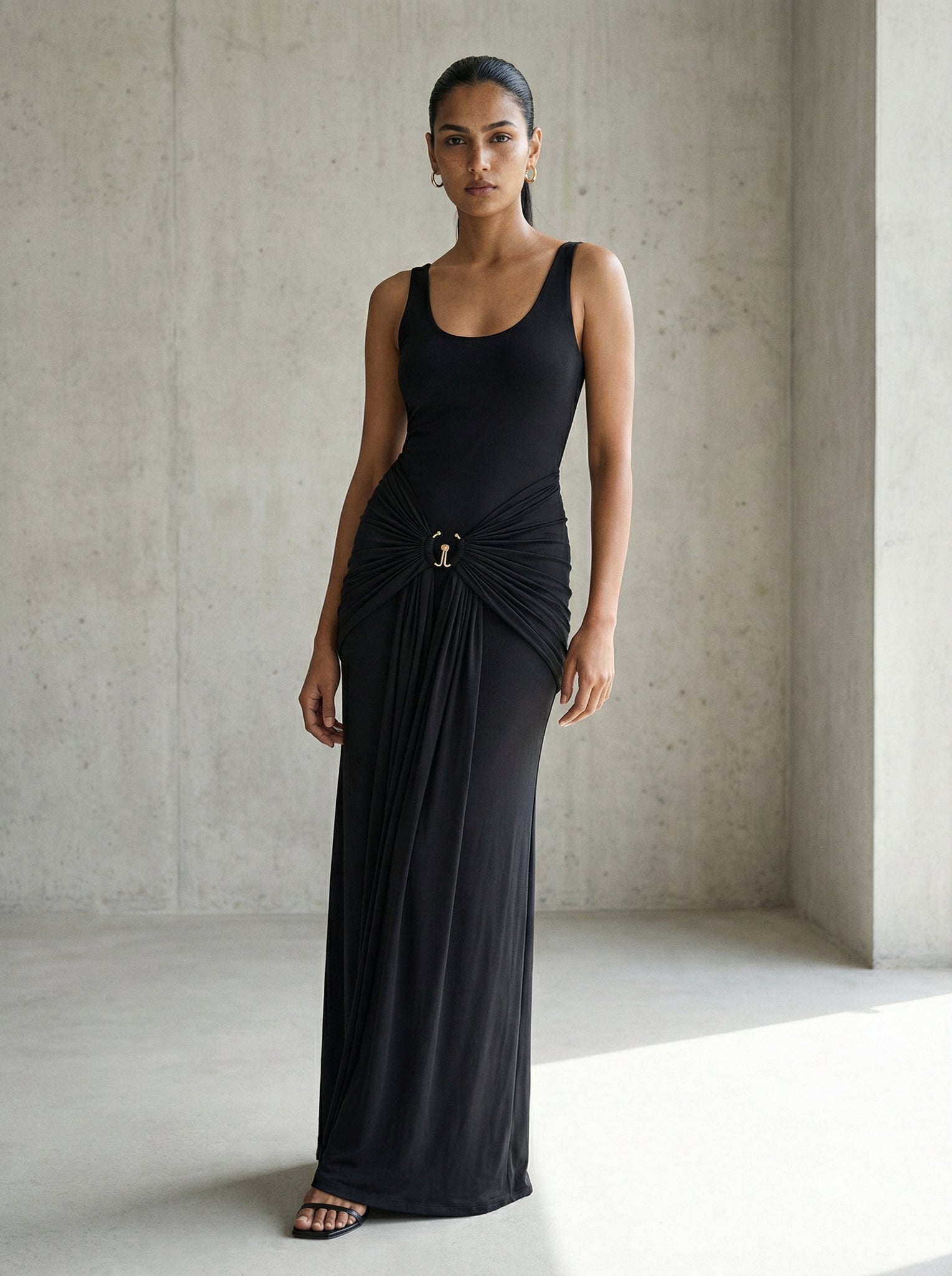 The artfully gathered drape at the waist, secured with a subtle metallic accent, enhances the natural curves and creates a fluid, elongating effect. The soft cascading folds add movement and depth, striking the perfect balance between structured sophistication and graceful femininity.