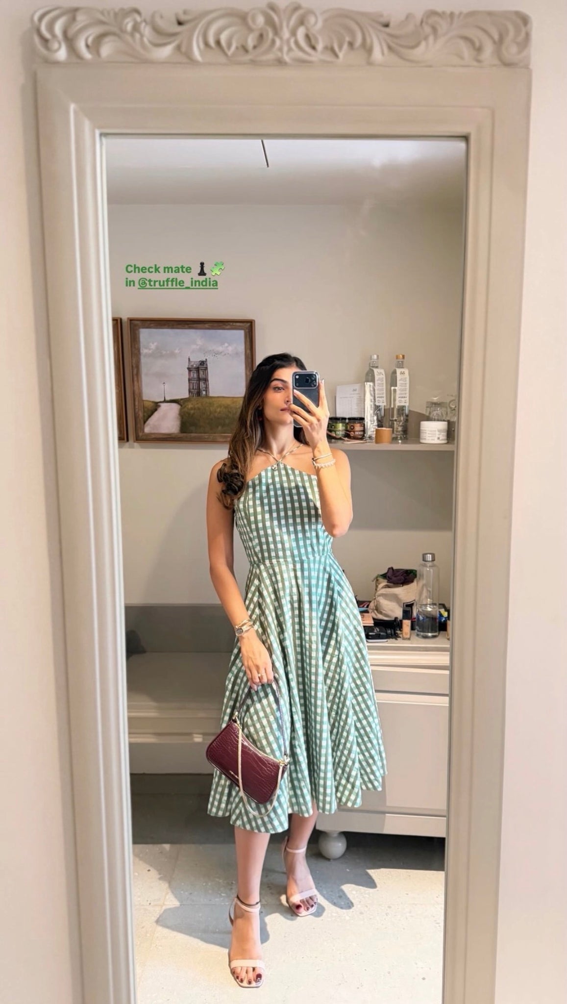 This green checkered dress features halter neck dress , making it the perfect choice for a day out. Its waist design adds a touch of elegance to your ensemble. Pair with heels for a stylish and sophisticated look.